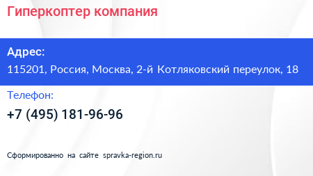 Гиперкоптер, компания по адресу 115201, Россия, Москва, 2-й Котляковский переулок, 18 в дальнейшем Организация, размещена в следующих категориях: