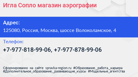 Игла Сопло, магазин аэрографии по адресу 125080, Россия, Москва, шоссе Волоколамское, 4 в дальнейшем Организация, размещена в следующих категориях: