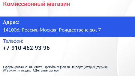 Комиссионный магазин по адресу 141006, Россия, Москва, Рождественская, 7 в дальнейшем Организация, размещена в следующих категориях: