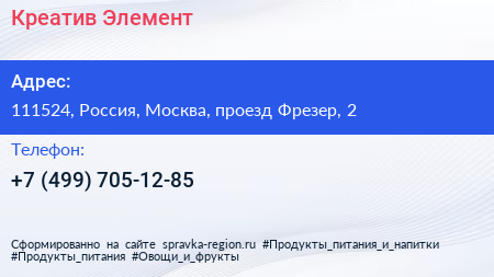 Креатив Элемент по адресу 111524, Россия, Москва, проезд Фрезер, 2 в дальнейшем Организация, размещена в следующих категориях: