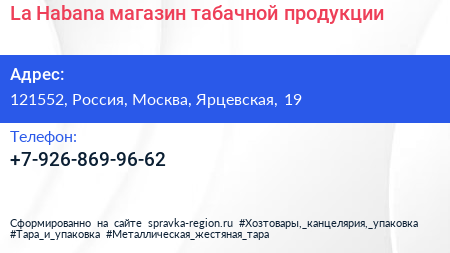 La Habana, магазин табачной продукции по адресу 121552, Россия, Москва, Ярцевская, 19 в дальнейшем Организация, размещена в следующих категориях: