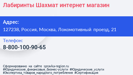Лабиринты Шахмат, интернет-магазин по адресу 127238, Россия, Москва, Локомотивный проезд, 21 в дальнейшем Организация, размещена в следующих категориях: