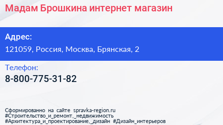 Мадам Брошкина, интернет-магазин по адресу 121059, Россия, Москва, Брянская, 2 в дальнейшем Организация, размещена в следующих категориях: