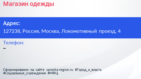 Магазин одежды по адресу 127238, Россия, Москва, Локомотивный проезд, 4 в дальнейшем Организация, размещена в следующих категориях: