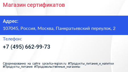 Магазин сертификатов по адресу 107045, Россия, Москва, Панкратьевский переулок, 2 в дальнейшем Организация, размещена в следующих категориях: