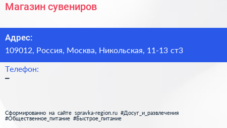 Магазин сувениров по адресу 109012, Россия, Москва, Никольская, 11-13 ст3 в дальнейшем Организация, размещена в следующих категориях: