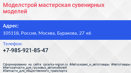 Моделстрой, мастерская сувенирных моделей по адресу 105118, Россия, Москва, Буракова, 27 к6 в дальнейшем Организация, размещена в следующих категориях: