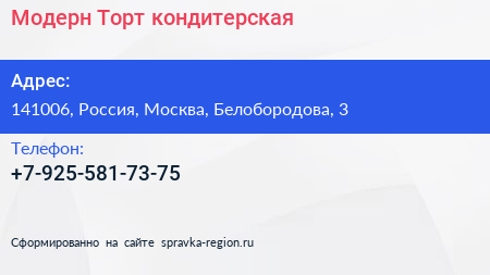 Модерн Торт, кондитерская по адресу 141006, Россия, Москва, Белобородова, 3 в дальнейшем Организация, размещена в следующих категориях: