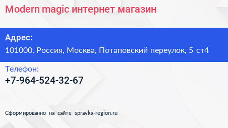 Modern magic, интернет-магазин по адресу 101000, Россия, Москва, Потаповский переулок, 5 ст4 в дальнейшем Организация, размещена в следующих категориях:
