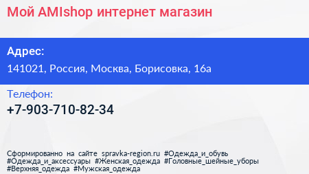 Мой AMIshop, интернет-магазин по адресу 141021, Россия, Москва, Борисовка, 16а в дальнейшем Организация, размещена в следующих категориях: