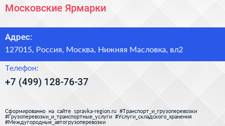 Московские Ярмарки по адресу 127015, Россия, Москва, Нижняя Масловка, вл2 в дальнейшем Организация, размещена в следующих категориях: