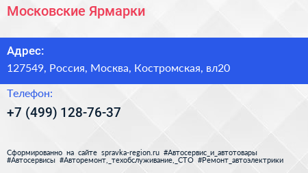 Московские Ярмарки по адресу 127549, Россия, Москва, Костромская, вл20 в дальнейшем Организация, размещена в следующих категориях:
