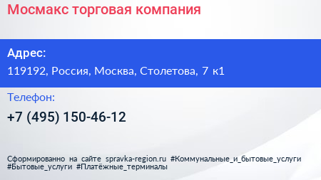 Мосмакс, торговая компания по адресу 119192, Россия, Москва, Столетова, 7 к1 в дальнейшем Организация, размещена в следующих категориях: