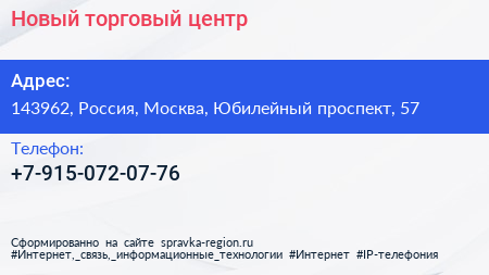 Новый, торговый центр по адресу 143962, Россия, Москва, Юбилейный проспект, 57 в дальнейшем Организация, размещена в следующих категориях: