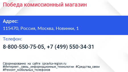 Победа, комиссионный магазин по адресу 115470, Россия, Москва, Новинки, 1 в дальнейшем Организация, размещена в следующих категориях: