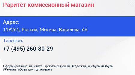 Раритет, комиссионный магазин по адресу 119261, Россия, Москва, Вавилова, 66 в дальнейшем Организация, размещена в следующих категориях: