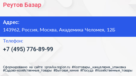 Реутов Базар по адресу 143962, Россия, Москва, Академика Челомея, 12Б в дальнейшем Организация, размещена в следующих категориях: