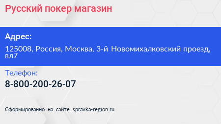 Русский покер, магазин по адресу 125008, Россия, Москва, 3-й Новомихалковский проезд, вл7 в дальнейшем Организация, размещена в следующих категориях: