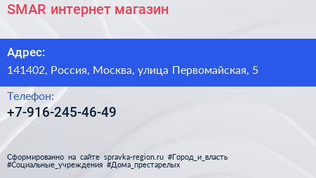 SMAR, интернет-магазин по адресу 141402, Россия, Москва, улица Первомайская, 5 в дальнейшем Организация, размещена в следующих категориях: