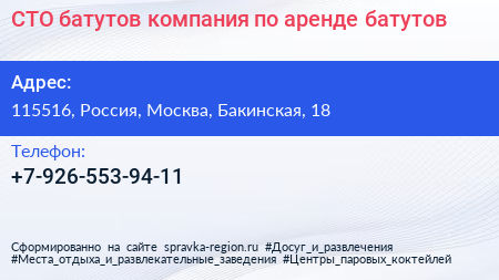 СТО батутов, компания по аренде батутов по адресу 115516, Россия, Москва, Бакинская, 18 в дальнейшем Организация, размещена в следующих категориях: