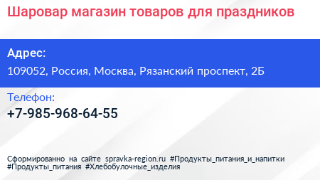 Шаровар, магазин товаров для праздников по адресу 109052, Россия, Москва, Рязанский проспект, 2Б в дальнейшем Организация, размещена в следующих категориях: