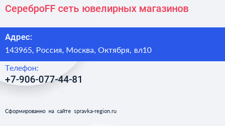 СереброFF, сеть ювелирных магазинов по адресу 143965, Россия, Москва, Октября, вл10 в дальнейшем Организация, размещена в следующих категориях: