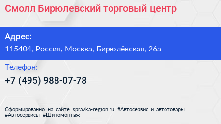 Смолл Бирюлевский, торговый центр по адресу 115404, Россия, Москва, Бирюлёвская, 26а в дальнейшем Организация, размещена в следующих категориях: