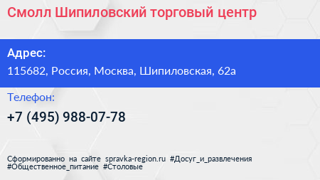 Смолл Шипиловский, торговый центр по адресу 115682, Россия, Москва, Шипиловская, 62а в дальнейшем Организация, размещена в следующих категориях: