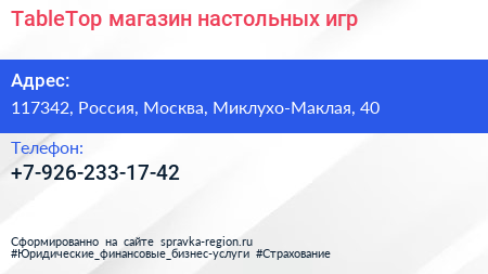 TableTop, магазин настольных игр по адресу 117342, Россия, Москва, Миклухо-Маклая, 40 в дальнейшем Организация, размещена в следующих категориях: