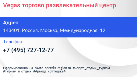 Vegas, торгово-развлекательный центр по адресу 143401, Россия, Москва, Международная, 12 в дальнейшем Организация, размещена в следующих категориях: