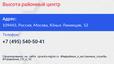 Высота, районный центр по адресу 109443, Россия, Москва, Юных Ленинцев, 52 в дальнейшем Организация, размещена в следующих категориях: