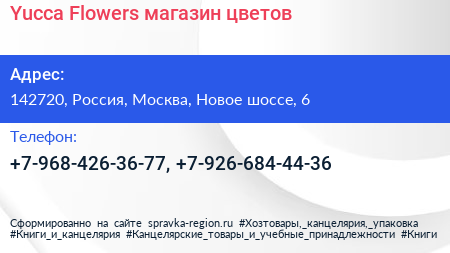 Yucca Flowers, магазин цветов по адресу 142720, Россия, Москва, Новое шоссе, 6 в дальнейшем Организация, размещена в следующих категориях: