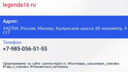 legenda16.ru по адресу 142704, Россия, Москва, Калужское шоссе 20 километр, 4 ст7 в дальнейшем Организация, размещена в следующих категориях: