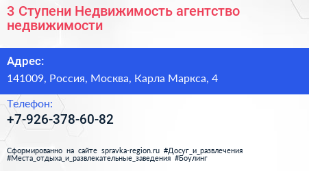3 Ступени Недвижимость, агентство недвижимости по адресу 141009, Россия, Москва, Карла Маркса, 4 в дальнейшем Организация, размещена в следующих категориях: