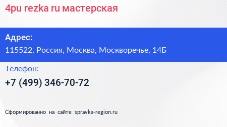 4pu-rezka.ru, мастерская по адресу 115522, Россия, Москва, Москворечье, 14Б в дальнейшем Организация, размещена в следующих категориях: