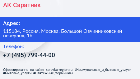 АК Саратник по адресу 115184, Россия, Москва, Большой Овчинниковский переулок, 16 в дальнейшем Организация, размещена в следующих категориях: