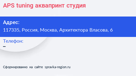 APS tuning, аквапринт-студия по адресу 117335, Россия, Москва, Архитектора Власова, 6 в дальнейшем Организация, размещена в следующих категориях: