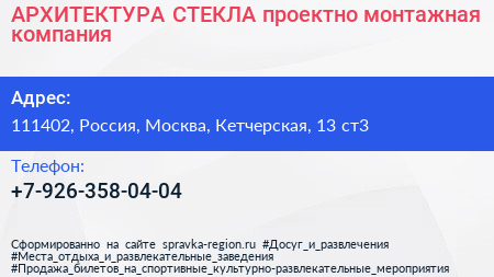 АРХИТЕКТУРА СТЕКЛА, проектно-монтажная компания по адресу 111402, Россия, Москва, Кетчерская, 13 ст3 в дальнейшем Организация, размещена в следующих категориях: