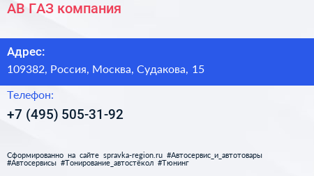 АВ-ГАЗ, компания по адресу 109382, Россия, Москва, Судакова, 15 в дальнейшем Организация, размещена в следующих категориях: