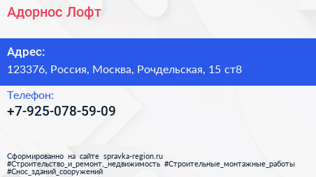 Адорнос Лофт по адресу 123376, Россия, Москва, Рочдельская, 15 ст8 в дальнейшем Организация, размещена в следующих категориях: