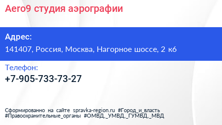 Aero9, студия аэрографии по адресу 141407, Россия, Москва, Нагорное шоссе, 2 к6 в дальнейшем Организация, размещена в следующих категориях: