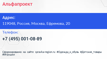Альфапроект по адресу 119048, Россия, Москва, Ефремова, 20 в дальнейшем Организация, размещена в следующих категориях: