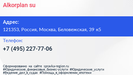 Alkorplan.su по адресу 121353, Россия, Москва, Беловежская, 39 к5 в дальнейшем Организация, размещена в следующих категориях: