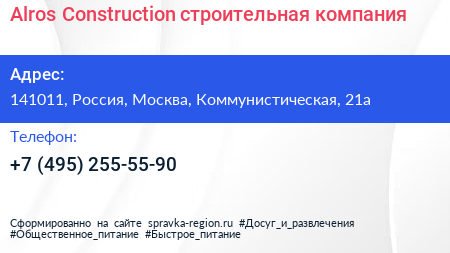 Alros Construction, строительная компания по адресу 141011, Россия, Москва, Коммунистическая, 21а в дальнейшем Организация, размещена в следующих категориях: