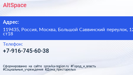 AltSpace по адресу 119435, Россия, Москва, Большой Саввинский переулок, 12 ст18 в дальнейшем Организация, размещена в следующих категориях: