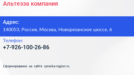 Альтезза, компания по адресу 140053, Россия, Москва, Новорязанское шоссе, 6 в дальнейшем Организация, размещена в следующих категориях: