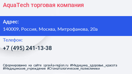 AquaTech, торговая компания по адресу 140009, Россия, Москва, Митрофанова, 20а в дальнейшем Организация, размещена в следующих категориях: