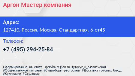 Аргон-Мастер, компания по адресу 127410, Россия, Москва, Стандартная, 6 ст45 в дальнейшем Организация, размещена в следующих категориях: