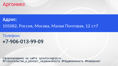 Аргоникс по адресу 105082, Россия, Москва, Малая Почтовая, 12 ст7 в дальнейшем Организация, размещена в следующих категориях: