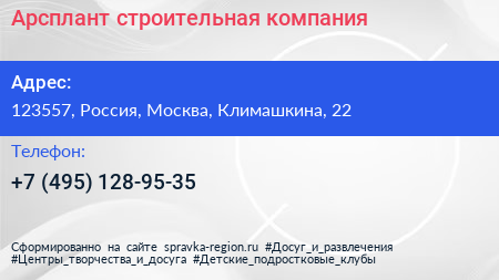 Арсплант, строительная компания по адресу 123557, Россия, Москва, Климашкина, 22 в дальнейшем Организация, размещена в следующих категориях: